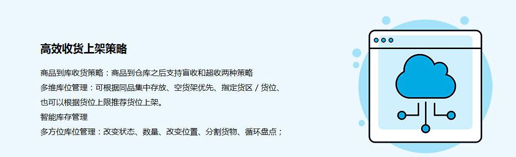 系統(tǒng)支持靈活多變的收貨策略、上架策略、補(bǔ)貨策略、揀貨策略、分配策略、盤點(diǎn)策略、波次策略和出庫(kù)策略等。